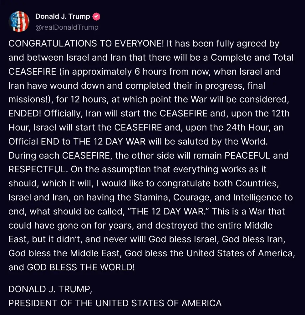 “Parabéns a todos! Foi totalmente acordado entre Israel e Irã que haverá um CESSAR-FOGO completo e total (em aproximadamente 6 horas a partir de agora, quando Israel e Irã tiverem concluído suas missões finais em andamento!), por 12 horas, momento em que a guerra será considerada ENCERRADA! Oficialmente, o Irã iniciará o cessar-fogo e, ao completar 12 horas, Israel iniciará o cessar-fogo e, ao completar 24 horas, o fim oficial da GUERRA DE 12 DIAS será celebrado pelo mundo. Durante cada cessar-fogo, o outro lado permanecerá PACÍFICO e RESPEITOSO. Supondo que tudo ocorra como deve, o que certamente acontecerá, gostaria de parabenizar ambos os países, Israel e Irã, pela resistência, coragem e inteligência para encerrar o que deve ser chamado de “GUERRA DE 12 DIAS”. Esta é uma guerra que poderia ter durado anos e destruído todo o Oriente Médio, mas não durou, e nunca durará! Deus abençoe Israel, Deus abençoe o Irã, Deus abençoe o Oriente Médio, Deus abençoe os Estados Unidos da América, e DEUS ABENÇOE O MUNDO!“
